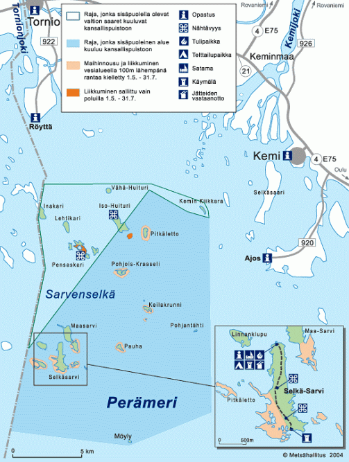 Perämeren pohjukassa. Puistossa on laajojen ulapoiden erottamia saariryhmiä. Puiston ala on 15700 hehtaaria ja siitä vain 250 hehtaaria on maata. Lintulajeja kansallispuiston alueella pesii kuutisenkymmentä. Puiston vesillä tavataan norppia ja halleja.